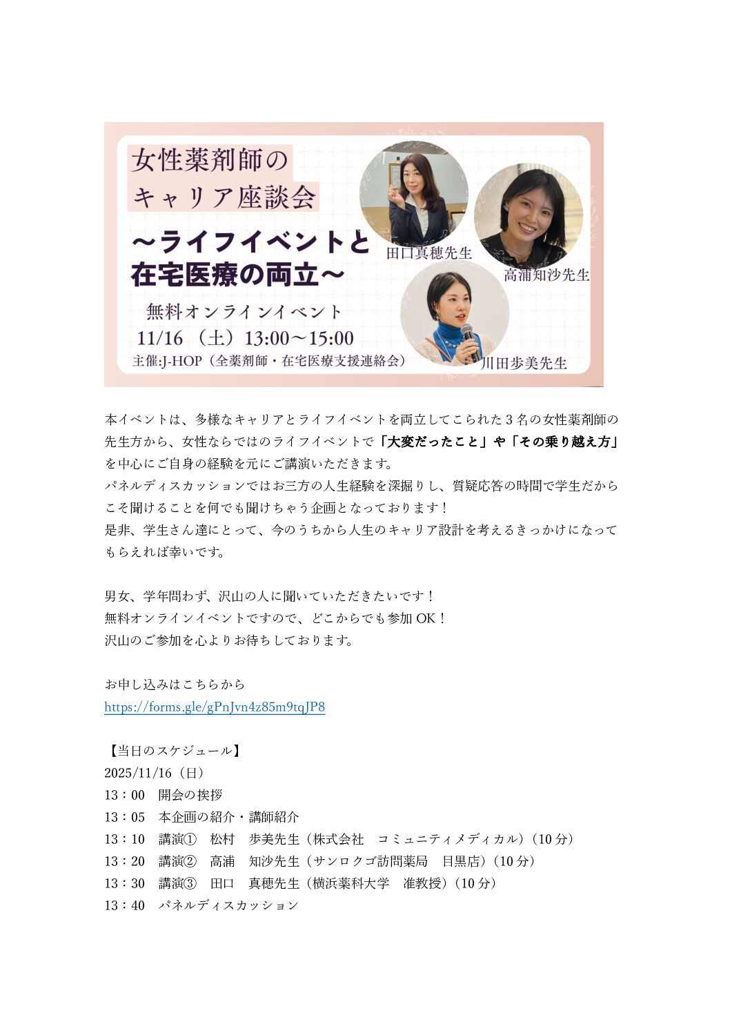 J-HOP学生企画「11/16(日)無料オンラインイベント:女性薬剤師のキャリア座談会〜ライフイベントと在宅医療の両立〜」